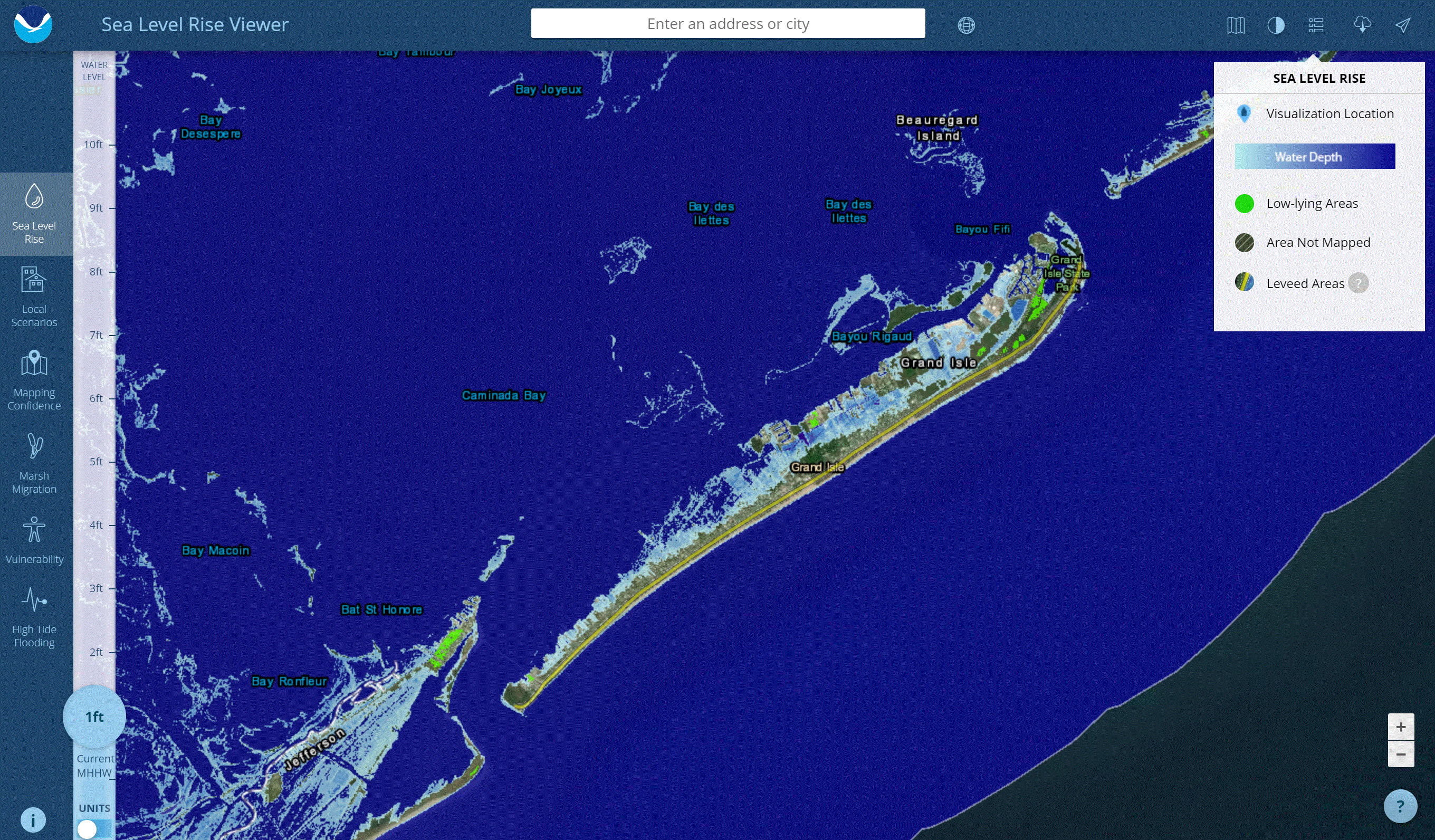 Before clicking on any of the tabs, take some time to play with the vertical slider on the left hand side of the screen. Pick a particular area you’re interested in (either by zooming in or typing in the address) and toggle between flood depths. As you’ll quickly realize, it doesn’t take a whole lot of sea level rise for an area to be completely inundated.